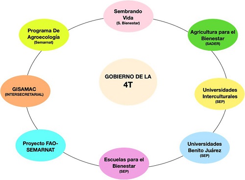 Entre ellos destacan dos grandes programas: Producción para el Bienestar, de la Secretaría de Agricultura (SADER) y Sembrando Vida, de la Secretaría del Bienestar. Juntos apoyan con subsidios a más de 3.2 millones de pequeños productores y sus familias (donde más del 80% poseen menos de 5 hectáreas), pero sobre todo crean “tejido social”, es decir organización local, utilizando principios agroecológicos. Es el caso de las llamadas “Comunidades de Aprendizaje Campesino” y de las “Escuelas de Campo”. Ambos programas cubren ya una superficie cercana a los 8 millones de hectáreas, y en ellos laboran más de 11 mil jóvenes que ofrecen asistencia técnica y social a los productores. En el campo de la educación, la agroecología ha sido integrada como tema de cursos y carreras en el sistema de las Universidades Benito Juárez (en al menos la mitad de sus 140 planteles) y en las Universidades Interculturales. También para el Conacyt la soberanía alimentaria conforma un Programa Nacional Estratégico, además de que apoya investigación aplicada para una agricultura libre de agrotóxicos y de cultivos transgénicos. Por su parte la Secretaría de Cultura ha creado el Museo Nacional del Maíz (Cencalli) en Chapultepec, que ilustra sobre la importancia cultural, histórica, nutricional, gastronómica y agroecológica de este alimento.