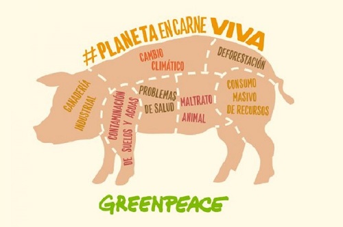 Greenpeace lanza hoy su campaña #PlanetaEnCarneViva con la que denunciará, durante las dos próximas semanas, las graves consecuencias que la ganadería industrial supone para el medioambiente, la salud de las personas y el bienestar animal. La campaña, enmarcada en el mes de Resistencia a la Ganadería Industrial establecido por la Coordinadora Estatal ‘Stop Ganadería Industrial’, quiere denunciar la insostenibilidad del actual sistema agroalimentario, basado en dietas con exceso de carne y otros derivados animales.